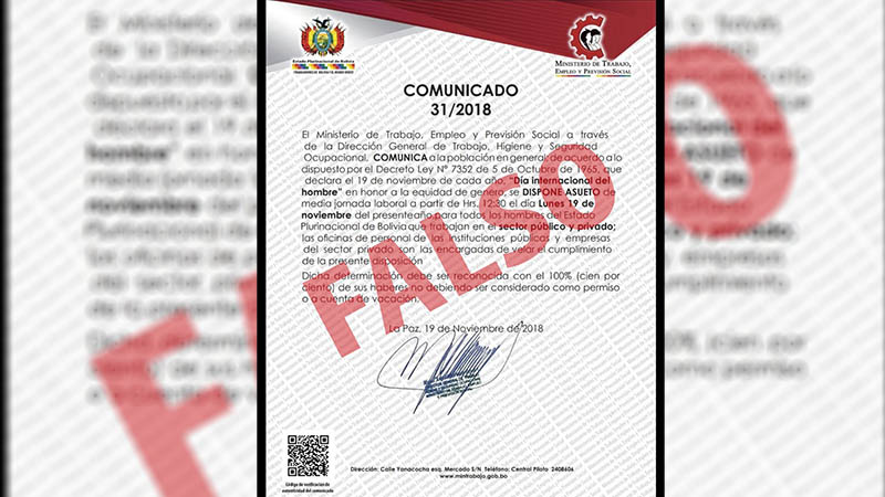 Desde tempranas horas empezó a circular en distintas redes sociales un comunicado falso que era atribuido al Ministerio de Trabajo, el cual estipulaba que se disponía asueto laboral de media jornada para todos los trabajadores de empresas públicas y privadas en conmemoración al Día Internacional del Hombre que se celebra hoy.