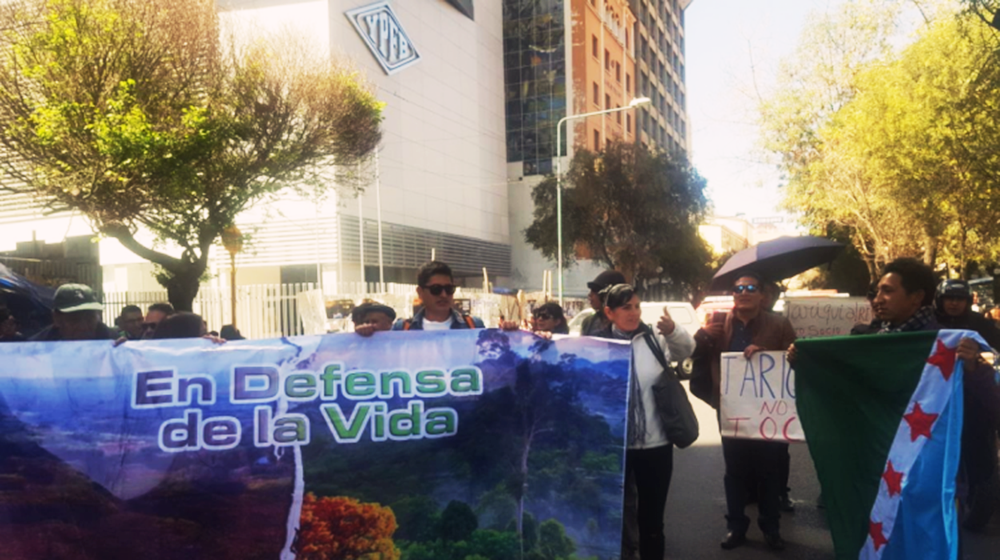 Al grito de ¡fuera petroleras de Bolivia! y otros estribillos, la marcha en defensa de la Reserva Nacional de Flora y Fauna Tariquía llegó hasta las puertas del edificio de YPFB en pleno centro de La Paz, donde realizó un plantón para exigir la anulación de los contratos petroleros suscritos para la exploración y explotación de hidrocarburos en las áreas de San Telmo Norte y Astillero.