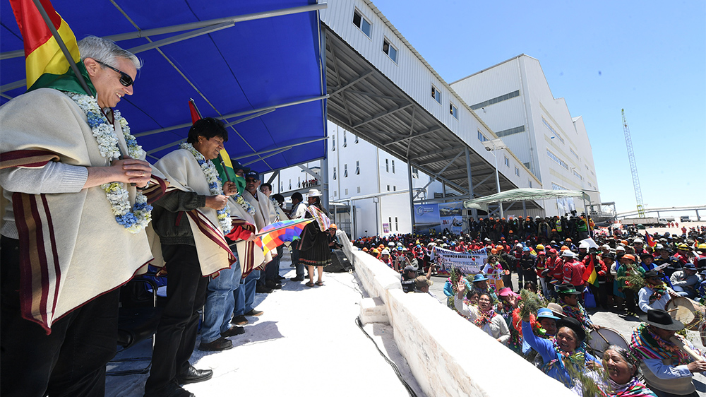 Por su parte, el ministro de Energías, Rafael Alarcón, calificó la planta de una "megaobra" que se alza en medio del Salar de Uyuni, que "costó mucho esfuerzo y que partió de la mirada visionaria del presidente".