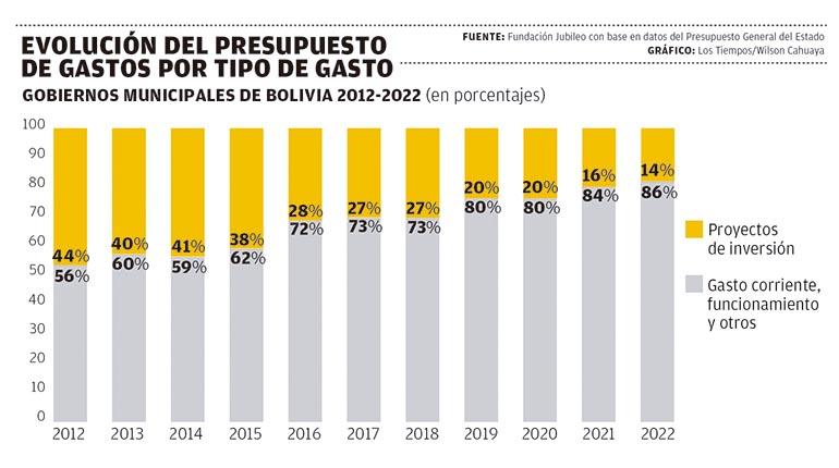 En el caso de los Gobiernos municipales, la diferencia es aún más marcada. En 2012, el gasto corriente llegaba al 56 por ciento y la inversión pública representaba el 44 por ciento del presupuesto, pero en 2022 el gasto corriente subió a un 86 por ciento y la inversión pública bajó a un 14 por ciento.