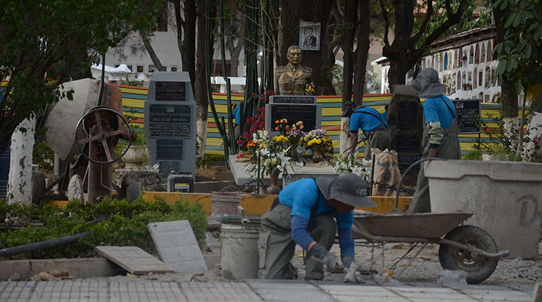 Más de 65 trabajadores de la empresa Leflocons remozan los ingresos, jardineras y áreas comunes del cementerio. Entre las obras que sobresalen, está el paseo peatonal de 1.100 metros con losetas y un presupuesto de un millón de bolivianos.