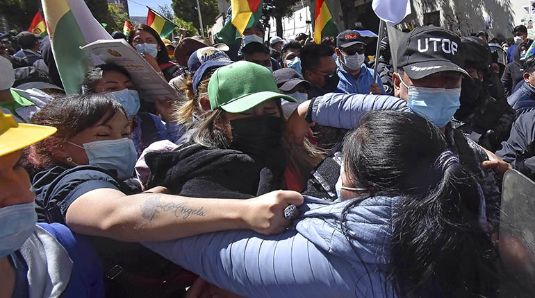 Por segunda vez en menos de un mes, el Movimiento Al Socialismo (MAS) envía a sus militantes a provocar enfrentamientos con sectores que protestan contra el Gobierno. Ayer, una manifestación en La Paz que pedía la liberación de la expresidenta Jeanine Áñez fue contenida en la puerta de la cárcel de Miraflores, donde se generaron peleas, insultos, acusaciones y un herido por piedra.