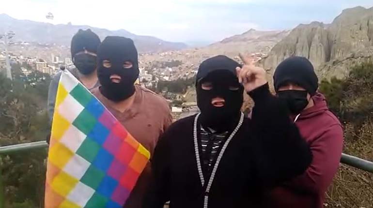 “Vas a conocer, cuando llegues a la ciudad de La Paz, nuestra justicia comunitaria. Vas a saber lo que es tener miedo”, asevera uno de los encapuchados, que además hace referencia a los incidentes con la wiphala en los actos protocolares de Santa Cruz