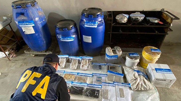 Esto llevó a 19 allanamientos y secuestraron más de 13 kilos de cocaína, tambores y bidones con precursores químicos para el estiramiento de la droga, además de una cocina industrial, un revólver, dos autos, dinero en pesos argentinos, dólares y moneda boliviana.