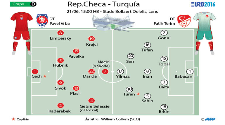 República Checa y Turquía se enfrentan hoy en Lens (15:00 HB), en su último partido del Grupo D de la Eurocopa, con la esperanza de ganar y optar al menos a clasificarse como uno de los cuatro mejores terceros de las seis llaves, aunque los checos podrían ser incluso segundos.