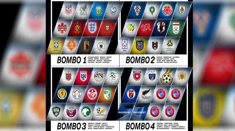 BOMBO 1: Canadá, México, Estados Unidos, ESPAÑA, Argentina, Francia, Inglaterra, Brasil, Portugal, Países Bajos, Bélgica y Alemania.
